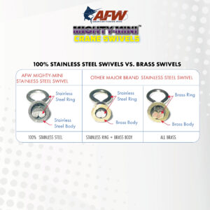 Mighty-Mini Swivels also have less drag and provide enhanced rotation for more strikes. For decades, swivels were manufactured from brass because it is a relatively corrosion resistant material and easy to manufacture. Still today, the leading brand of mini swivels continues to use brass bodies with stainless steel rings that cannot match the strength of Mighty Mini Swivels. Recent advances in manufacturing enable us to bring you these revolutionary, smaller and stronger components, and are the ultimate in connection protection.