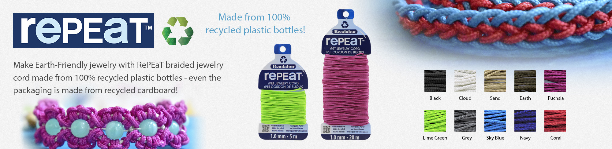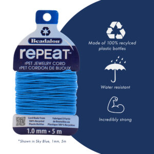 Make Earth-Friendly jewelry with RePEaT braided jewelry cord made from 100% recycled plastic bottles – even the packaging is made from recycled cardboard! Made in The Netherlands.