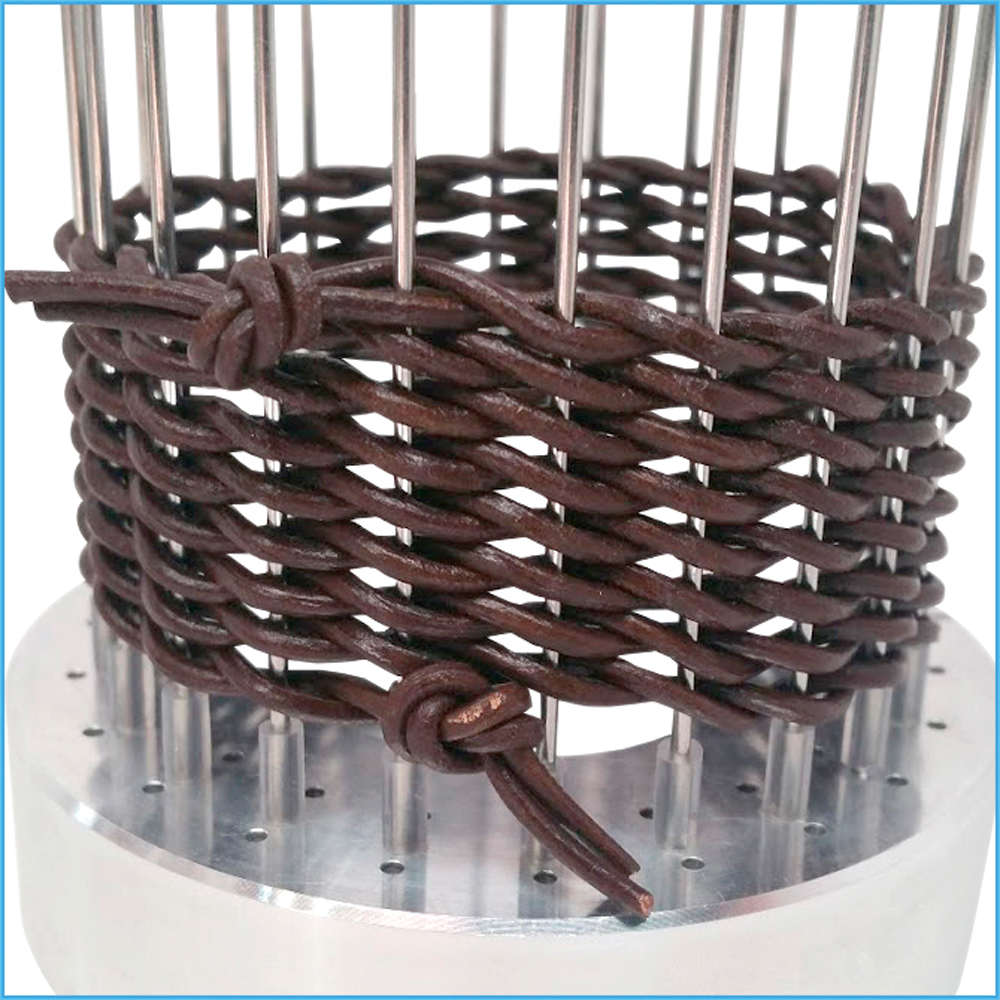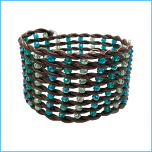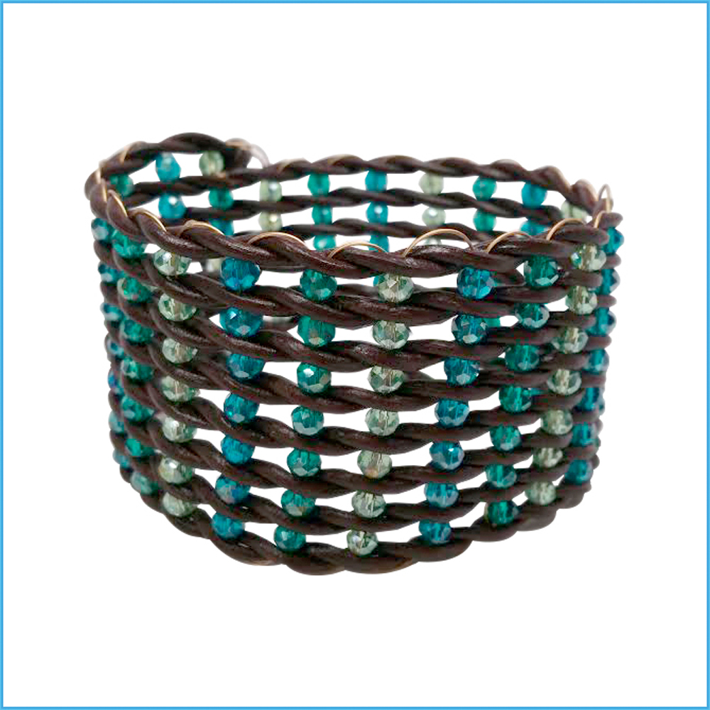 TOOLS AND MATERIALS USED: Beadalon Tools: Bangle Bracelet Weaver Tool Designer Beading Scissors Large Eye Needles Crimper Tool G-S Hypo Cement Beadalon Materials: Brown Greek Leather Gold Color Bead Stringing Wire Gold Color Crimp Tube Beads: 155 4mm Crystal Rondelle Beads INSTRUCTIONS: 1. Tie the two sections of Brown Greek Leather together with an overhand knot. Apply G-S Hypo Cement to the knot and allow it to dry. 2. Place the knot behind one of the rods on the Bangle Bracelet Weaver Tool. 3. Following the instructions included with the Bangle Bracelet Weaver Tool (Steps 2-7), weave a bracelet with the Greek Leather that is 8 wraps thick. 4. Tie an overhand knot close to the last rod and trim the ends. Apply G-S Hypo Cement to the knot and allow it to dry. 5. Slide the bracelet to the middle of the warp pins and carefully remove the tool from the base. 6. Gently separate the leather rows, creating a small space in between each row. 7. Cut approximately 8 feet of 19 Strand .38mm Gold Color Bead Stringing Wire and add a Large Eye Needle to each end. 8. Thread one end of the Bead Stringing Wire in between the woven Greek Leather next to the warp pins and add a 4mm Crystal Rondelle to the needle. 9. Continue threading the Bead Stringing Wire between the woven Greek Leather next to the warp pins, adding a 4mm Crystal Rondelle between the rows until you have reached the opposite side of the bracelet. 10. Pick up both ends of the Bead Stringing Wire and center the bracelet on the wire. 11. Thread one wire from one side and the other wire from the other side so that the weft wires cross inside the next space created between the woven wire and warp pin, adding crystals between the rows as you work. 12. Follow the instructions included with the Bangle Bracelet Weaver Tool (Steps 16-25) to complete the bracelet.